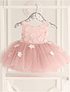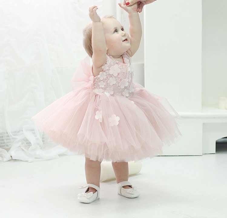 Delicadeza es su sinónimo. Color palo de rosa, con aplicaciones de flores en el corsé cosido uno por uno a la capa superior del tul de la falda. Muy liviano con un forro de 100% de algodón. Si su bebe no soporta vestidos, este ni lo notara! Atrás un hermoso lazo terminando la espalda en V. Perfecto para un Cumpleaños, Paje o Bautizo.