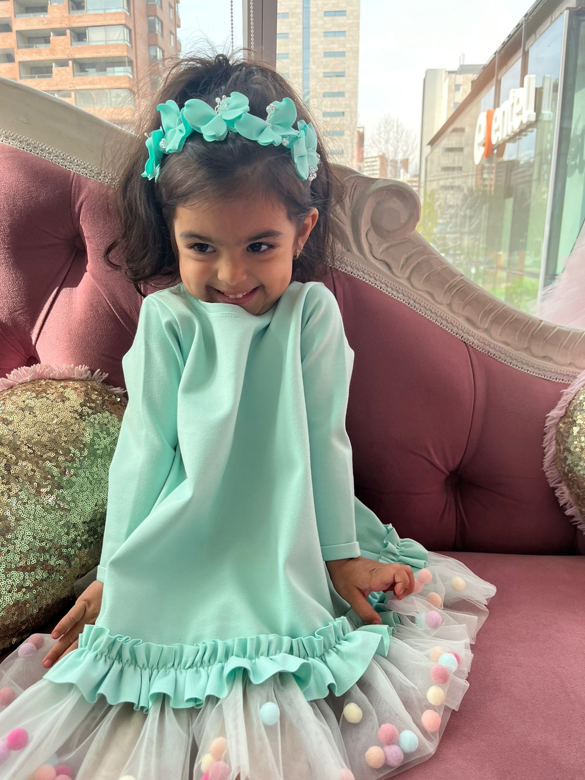 Vestido perfecto como para una salida o para celebrar cumpleaños. Color turquesa, decoración del faldón del vestido con mas de cien pelotitas de colores pasteles. El lazo ubicado al costado del vestido es desmontable. La tela (80% de algodón y 20% de poliéster) es muy suave y a la vez calentita. Usado con calcetines es una perfecta opción para Otoño o Primavera, usado con Leotardos Condor es ideal para usar en Invierno.
